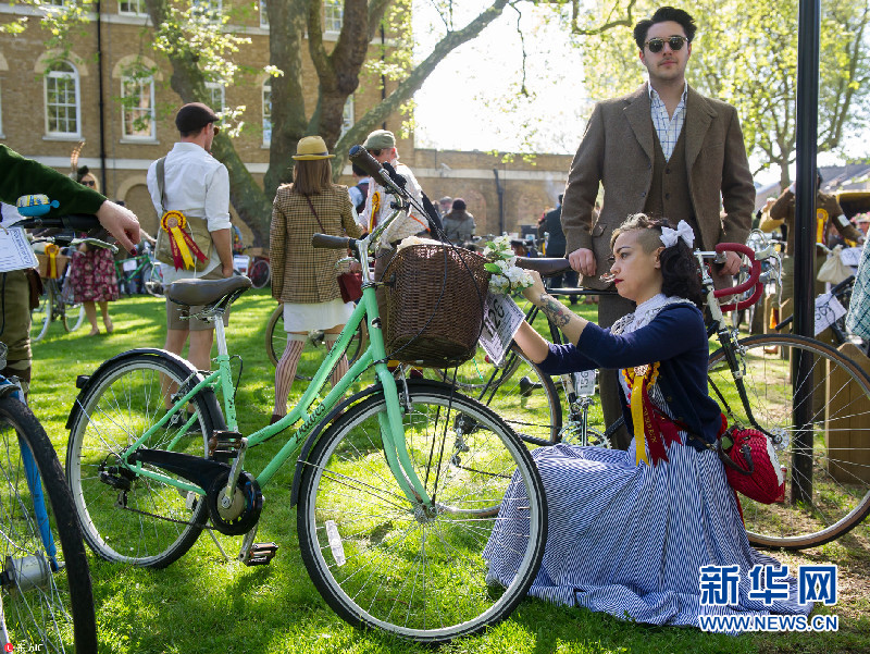 當地時間2018年5月5日,英國倫敦,當地舉辦復古騎行活動,民眾身穿花呢子服裝騎車穿行在倫敦街頭。今年是該活動舉辦十周年。(圖片來源:東方IC)