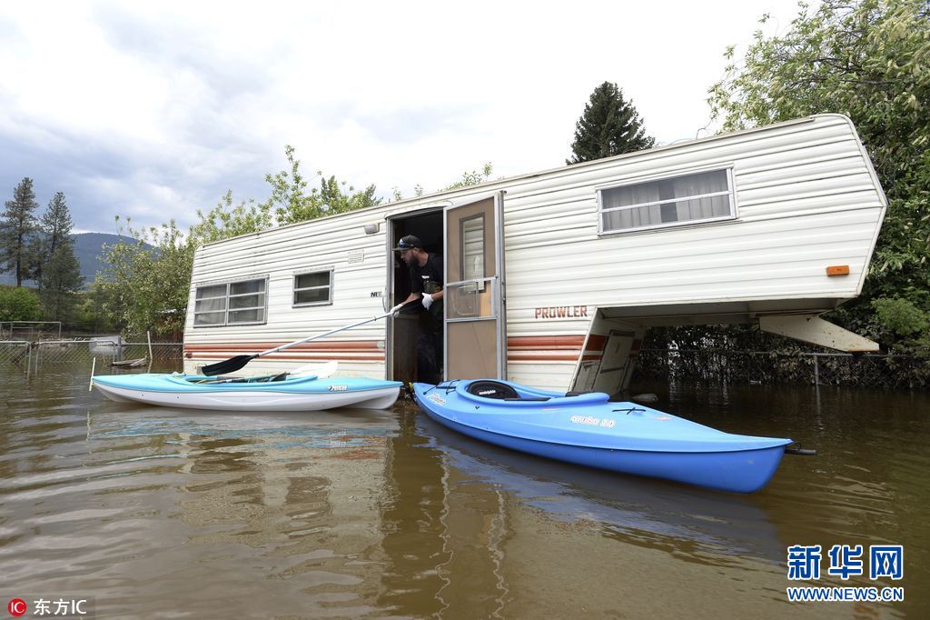 5月17日,加拿大不列顛哥倫比亞省Grand Forks,當(dāng)?shù)卦夂樗u擊,房屋、車輛浸泡水中。(圖片來(lái)源:東方IC)