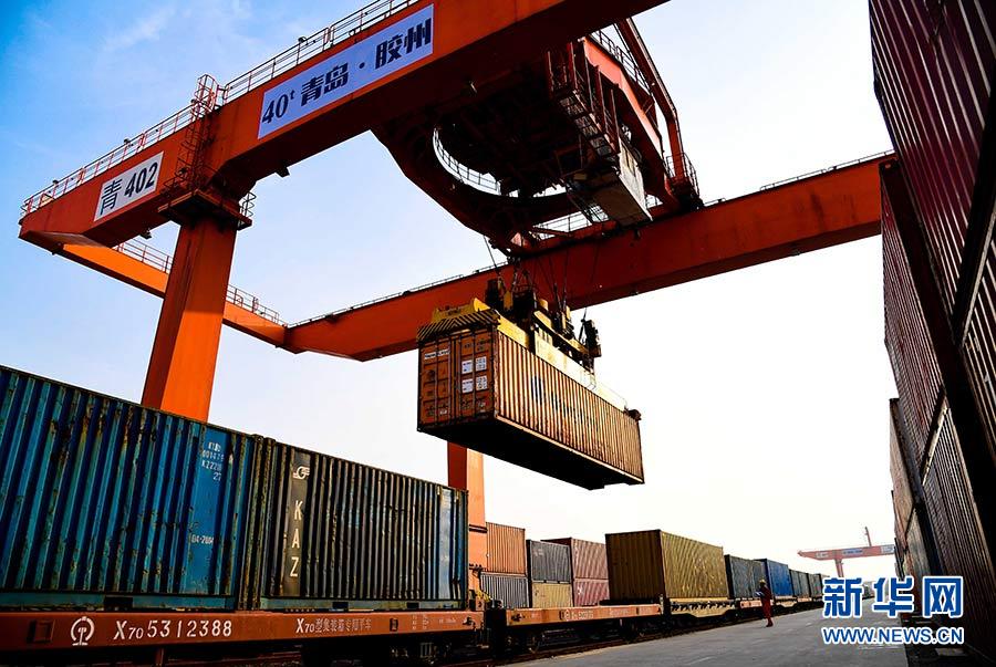 在青島膠州灣國(guó)際物流園,龍門(mén)塔吊在往中亞班列上裝載貨物(2018年5月7日攝)。該班列將通過(guò)阿拉山口至哈薩克斯坦的阿拉木圖。新華社記者 郭緒雷 攝