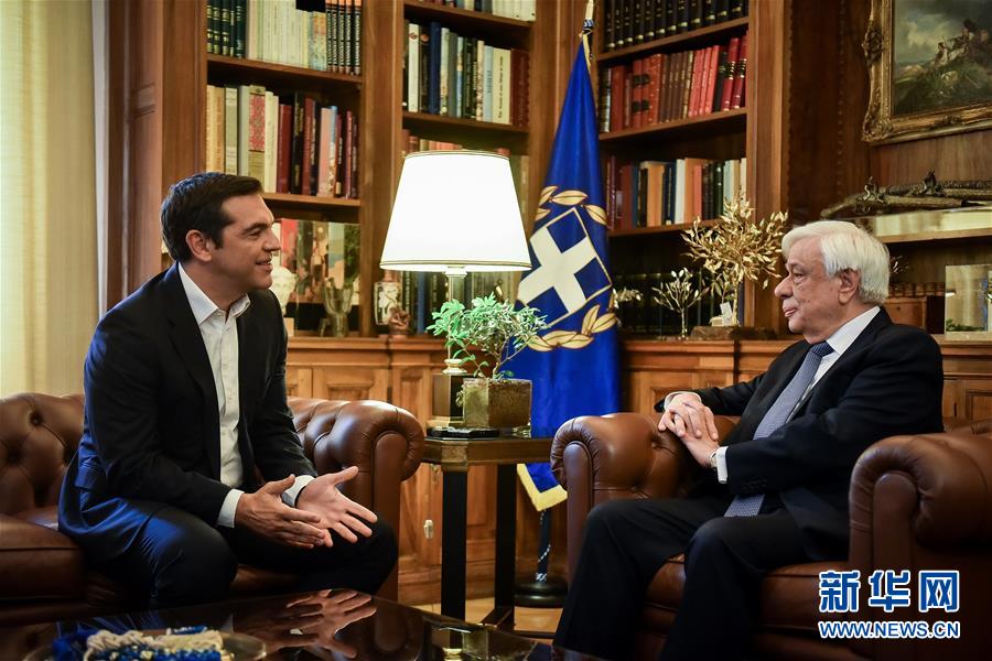 6月12日,在希臘雅典,希臘總理齊普拉斯(左)向希臘總統帕夫洛普洛斯通報他與扎埃夫的通話情況。新華社發(馬里奧斯·羅洛斯攝)