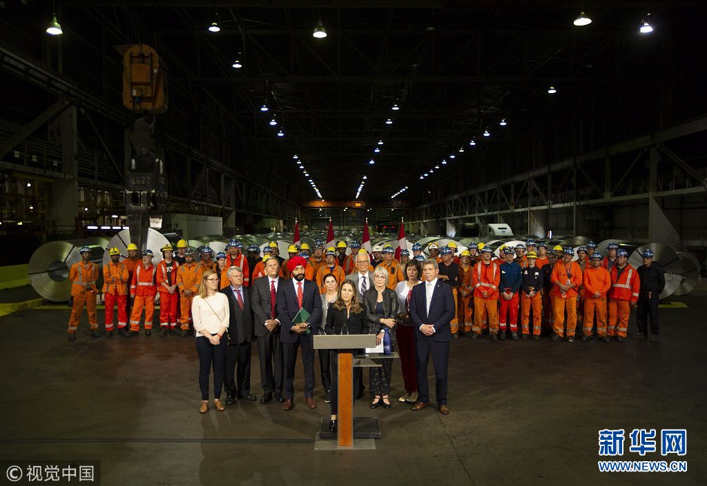 當(dāng)?shù)貢r間2018年6月29日,加拿大漢密爾頓,加拿大外交部長弗里蘭、經(jīng)濟發(fā)展部長貝恩斯和勞工部長哈伊杜造訪斯特爾科鋼鐵公司,并共同宣布從7月1日起,加拿大將對約126億美元從美國進口的商品加征關(guān)稅,以報復(fù)特朗普政府對加拿大鋼鋁產(chǎn)品加征關(guān)稅。他們還表示,加拿大政府將向本國鋼鋁產(chǎn)業(yè)和制造業(yè)提供約15億美元財政援助。(圖片來源:視覺中國)