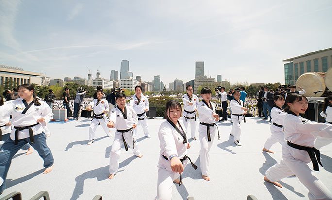 參加本次活動(dòng)的既有年輕人,也有老年人。整個(gè)表演經(jīng)過(guò)精心編排,持續(xù)了10分鐘時(shí)間,所有參與者在表演中都穿著傳統(tǒng)的跆拳道服。