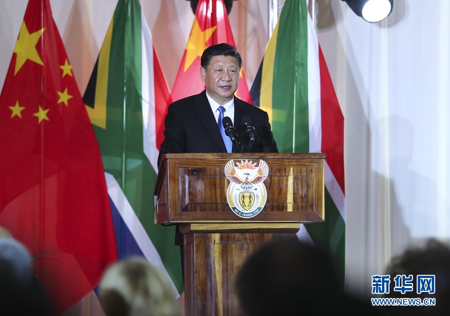 7月24日,國家主席習(xí)近平在比勒陀利亞出席南非總統(tǒng)拉馬福薩舉行的歡迎習(xí)近平主席對(duì)南非進(jìn)行國事訪問暨慶祝中南建交20周年晚宴。這是習(xí)近平發(fā)表致辭?!⌒氯A社記者 謝環(huán)馳 攝