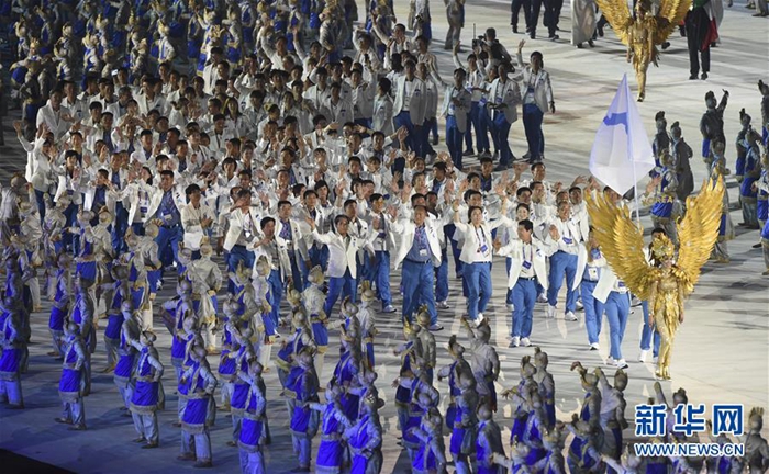 新華社雅加達8月18日電(記者 陸睿)第18屆亞運會當地時間18日晚7時在雅加達朋加諾體育場揭開帷幕。繼今年2月韓國平昌冬奧會開幕式之后,朝鮮和韓國體育代表團再次攜手在國際體育盛會共同入場,引發現場觀眾歡呼。