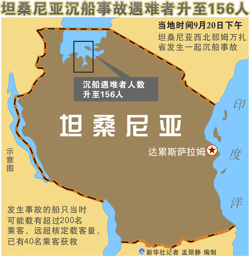 新華社達(dá)累斯薩拉姆9月22日電(記者李斯博 高竹)坦桑尼亞官員22日說,該國(guó)西北部姆萬扎省20日發(fā)生的沉船事故已造成至少156人死亡。