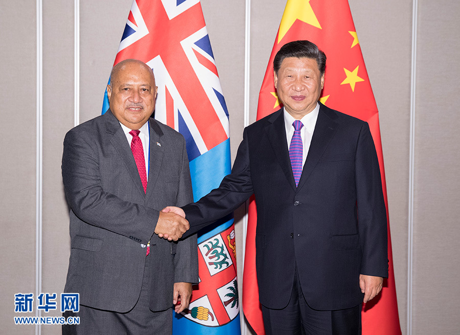 11月16日,國家主席習近平在莫爾茲比港會見斐濟政府代表、國防部長昆布安博拉。 新華社記者 黃敬文 攝