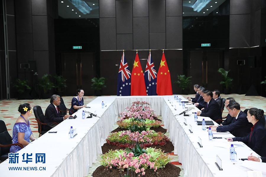 11月16日,國家主席習近平在莫爾茲比港分別會見建交太平洋島國領導人。這是習近平會見紐??偫硭?新華社記者 丁林 攝