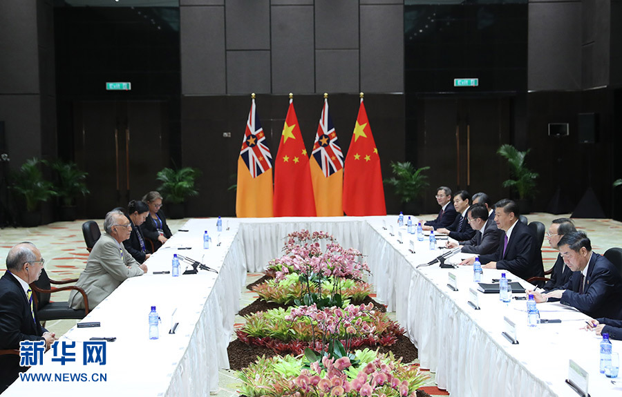 11月16日,國家主席習近平在莫爾茲比港分別會見建交太平洋島國領導人。這是習近平會見紐埃總理塔拉吉。 新華社記者 丁林 攝