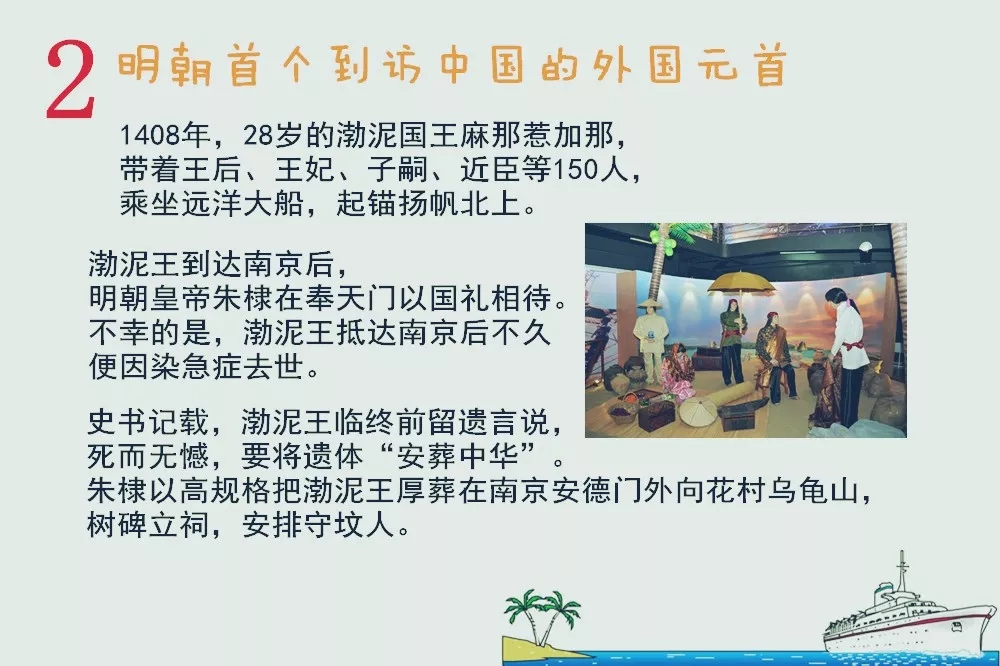 因擔(dān)心渤泥政局動(dòng)蕩,朱棣還特派張謙、周航兩位使臣護(hù)送太子遐旺返回渤泥襲王位并助他鎮(zhèn)守一年。1412年農(nóng)歷九月,新國(guó)王遐旺帶著母親、叔父等一批人再次訪華。明朝歷史上,外國(guó)國(guó)王來訪,渤泥王麻那惹加那是第一人。