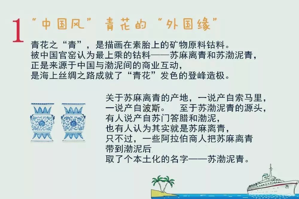 然而,很少有人知道,青花雖是“中國(guó)風(fēng)”,但卻有段“外國(guó)緣”。青花之“青”,是描畫在素胎上的礦物原料鈷料。被中國(guó)官窯認(rèn)為最上乘的鈷料——蘇麻離青和蘇渤泥青,正是來源于中國(guó)與渤泥間的商業(yè)互動(dòng),是海上絲綢之路成就了“青花”發(fā)色的登峰造極。