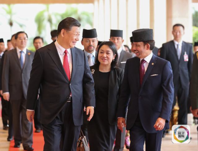 11月19日,國家主席習近平在斯里巴加灣同文萊蘇丹哈桑納爾舉行會談。這是會談前,習近平同哈桑納爾步入會場。新華社記者 鞠鵬 攝
