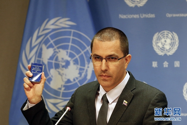 2月12日,在位于紐約的聯(lián)合國總部,委內(nèi)瑞拉外交部長阿雷亞薩出席記者會(huì)。新華社記者 李木子 攝