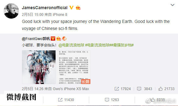 正如好萊塢大導演詹姆斯·卡梅隆在社交媒體上對《流浪地球》發出的祝愿:“祝中國科幻電影之旅好運!”