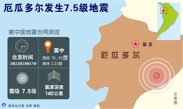 新華社北京2月22日電 據中國地震臺網正式測定,北京時間2019年2月22日18時17分,在厄瓜多爾(南緯2.15度,西經76.91度)發生7.5級地震,震源深度140千米。