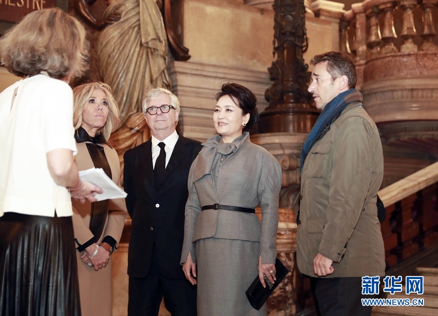 當地時間3月25日,國家主席習近平夫人彭麗媛在法國總統夫人布麗吉特陪同下參觀位于巴黎市第九區的法國巴黎歌劇院。新華社記者 丁林 攝