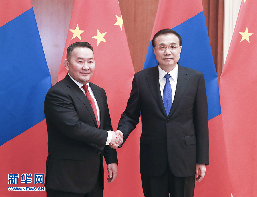 李克強表示,中蒙是山水相連的友好鄰邦。今年適逢中蒙建交70周年和《中蒙友好合作關系條約》修訂25周年,兩國關系迎來新的發展機遇。習近平主席將同總統先生舉行會談,規劃兩國關系下一步發展。中方愿同蒙方加強政治互信,尊重彼此核心利益和重大關切,推動中蒙全面戰略伙伴關系再上新臺階。我們愿在相互尊重、平等合作、互利互惠的基礎上深化雙方務實合作,將“一帶一路”倡議同蒙方“發展之路”倡議對接,加快推進中蒙自貿協定和經濟合作區,深化在農業、產能、人文等領域的交流合作,繼續在邊境運輸、口岸建設等方面為蒙方提供便利。