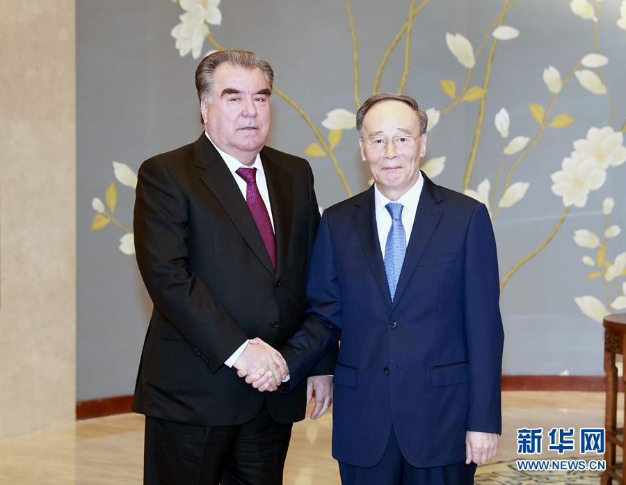 4月28日,國家副主席王岐山在北京釣魚臺國賓館會見塔吉克斯坦總統(tǒng)拉赫蒙。 新華社記者 丁林 攝
