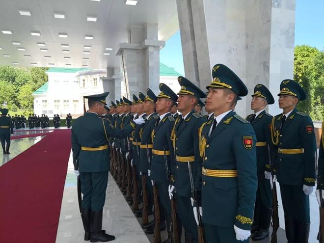 檢閱儀仗隊(duì)時(shí),習(xí)近平主席走到儀仗隊(duì)中央,用吉爾吉斯語(yǔ)向儀仗隊(duì)員問候:戰(zhàn)士們好!儀仗隊(duì)員用吉爾吉斯語(yǔ)回答:歡迎您!