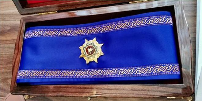 這就是授予習(xí)近平主席的勛章。“瑪納斯”勛章是吉爾吉斯斯坦國(guó)家最高獎(jiǎng)?wù)拢杉獱柤顾固箍偨y(tǒng)授予,分三個(gè)等級(jí),一級(jí)為最高等級(jí)。新華社記者 丁林 攝