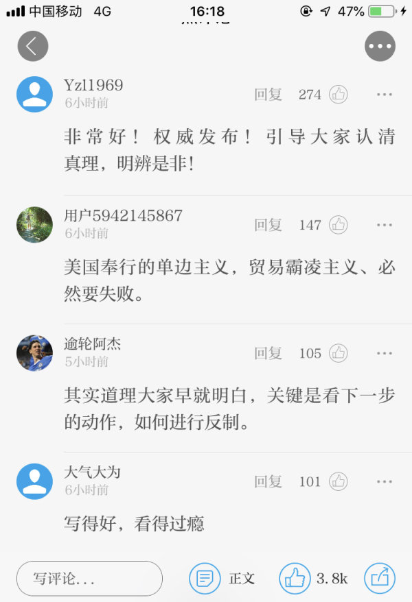 文章刊發后,網友紛紛轉發、點贊,表示“全面、清晰且深刻?!薄皺嗤l布!引導大家認清真理,明辨是非!”“美國奉行的單邊主義,貿易霸凌主義、必然要失敗。 ”