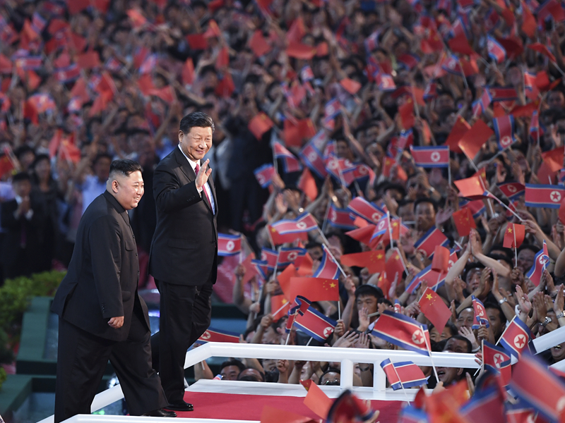演出在以“朝中友誼萬(wàn)古長(zhǎng)青”為主題的大型歌舞表演中結(jié)束。習(xí)近平和金正恩同全場(chǎng)觀眾一起站立,為藝術(shù)家和演員們的精湛表演送上經(jīng)久不息的掌聲。