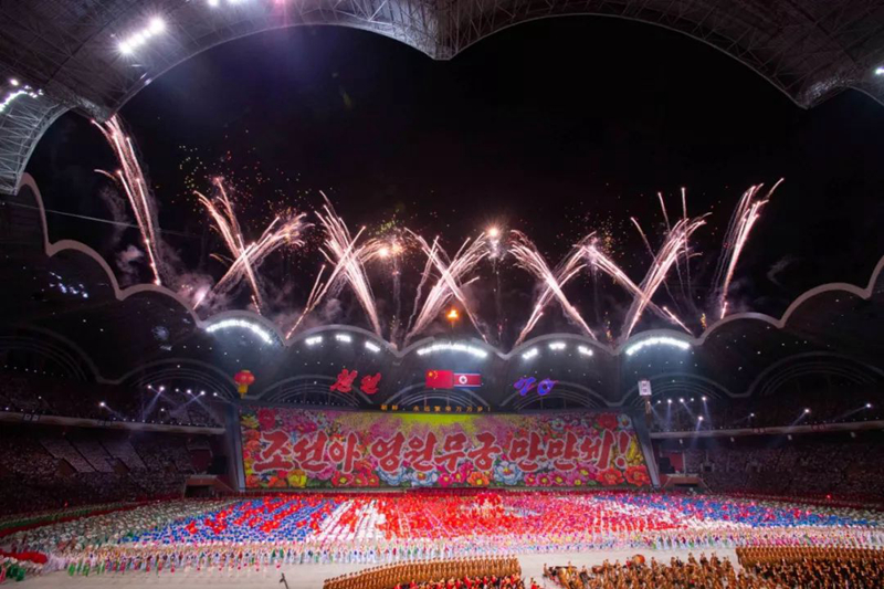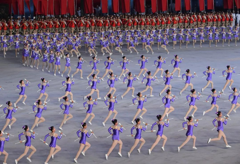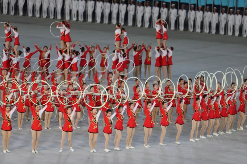平壤大同江畔,綾羅島“五一”體育場(chǎng)是團(tuán)體操的主要舞臺(tái)。演出以朝鮮民族獨(dú)特的“歌舞之美”、富有活力的團(tuán)體操、嘆為觀止的雜技表演,展現(xiàn)出朝鮮革命與戰(zhàn)爭(zhēng)、政治和軍隊(duì)建設(shè)、民生與經(jīng)濟(jì)發(fā)展以及對(duì)外交往的宏偉畫(huà)卷。