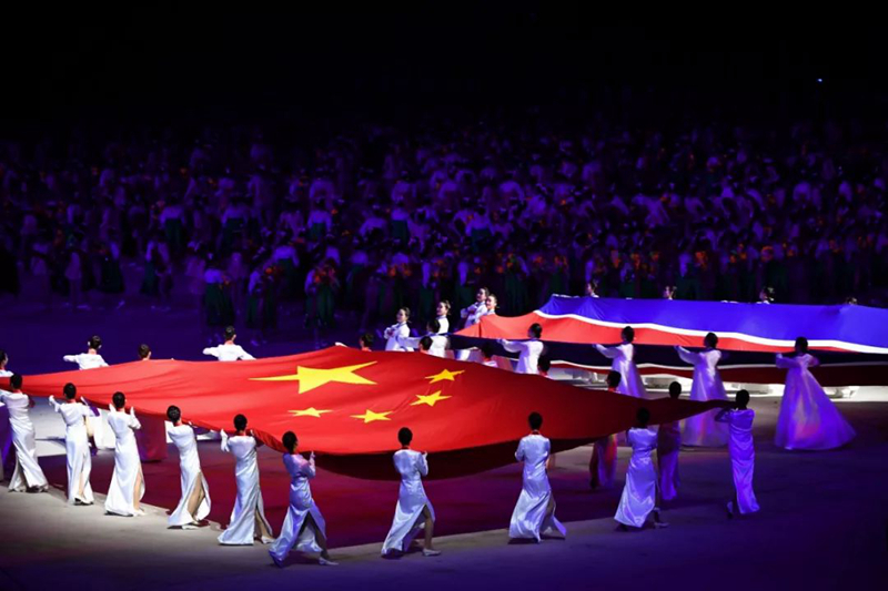 當(dāng)晚,能容納10萬(wàn)余人的“五一”體育場(chǎng)座無(wú)虛席。“熱烈歡迎習(xí)近平總書(shū)記同志和彭麗媛女士”、“平壤-北京”等標(biāo)語(yǔ)格外醒目。