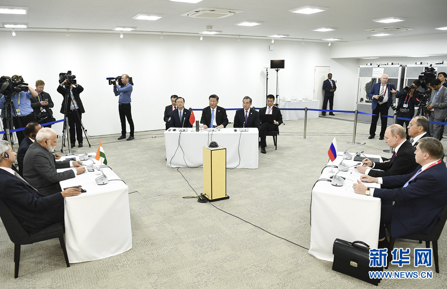 6月28日,國家主席習近平在大阪出席中俄印領導人會晤,同俄羅斯總統普京、印度總理莫迪就當前國際形勢、重大國際和地區問題、三方合作深入交換意見。 新華社記者 謝環馳 攝