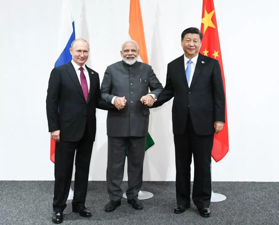↑6月28日,習主席在大阪出席中俄印領導人會晤,同俄羅斯總統(tǒng)普京、印度總理莫迪就當前國際形勢、重大國際和地區(qū)問題、三方合作深入交換意見。新華社記者謝環(huán)馳攝