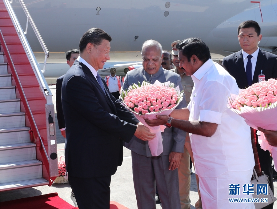 10月11日,國(guó)家主席習(xí)近平乘專機(jī)抵達(dá)金奈,應(yīng)印度共和國(guó)總理莫迪邀請(qǐng),出席中印領(lǐng)導(dǎo)人第二次非正式會(huì)晤。印度泰米爾納德邦邦長(zhǎng)普羅希特、首席部長(zhǎng)帕拉尼斯瓦米等在舷梯旁迎接,向習(xí)近平敬獻(xiàn)鮮花。 新華社記者 鞠鵬 攝