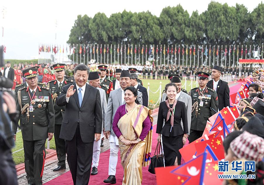 10月12日,國家主席習近平乘專機抵達加德滿都,開始對尼泊爾進行國事訪問。尼泊爾總統班達里在機場為習近平舉行具有濃郁尼泊爾民族特色的歡迎儀式。這是習近平在班達里陪同下檢閱儀仗隊。 新華社記者 李學仁 攝