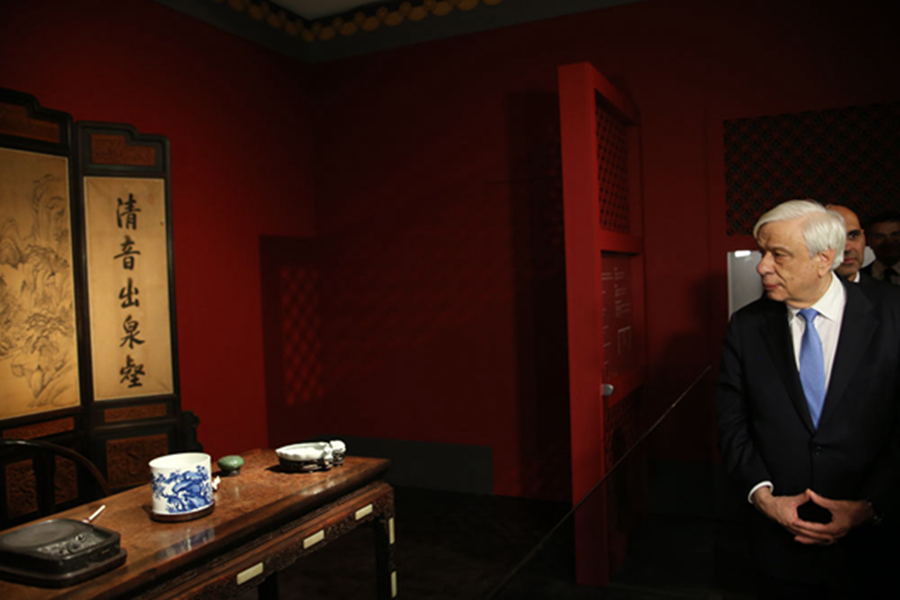 2018年9月14日,在希臘首都雅典衛(wèi)城博物館,希臘總統(tǒng)帕夫洛普洛斯(右)在“重文德之光華:重華宮原狀文物展”上參觀。這是來(lái)自中國(guó)故宮博物院的154件清朝乾隆時(shí)期珍貴文物首次出國(guó)展出。新華社發(fā)(馬里奧斯·羅洛斯攝)