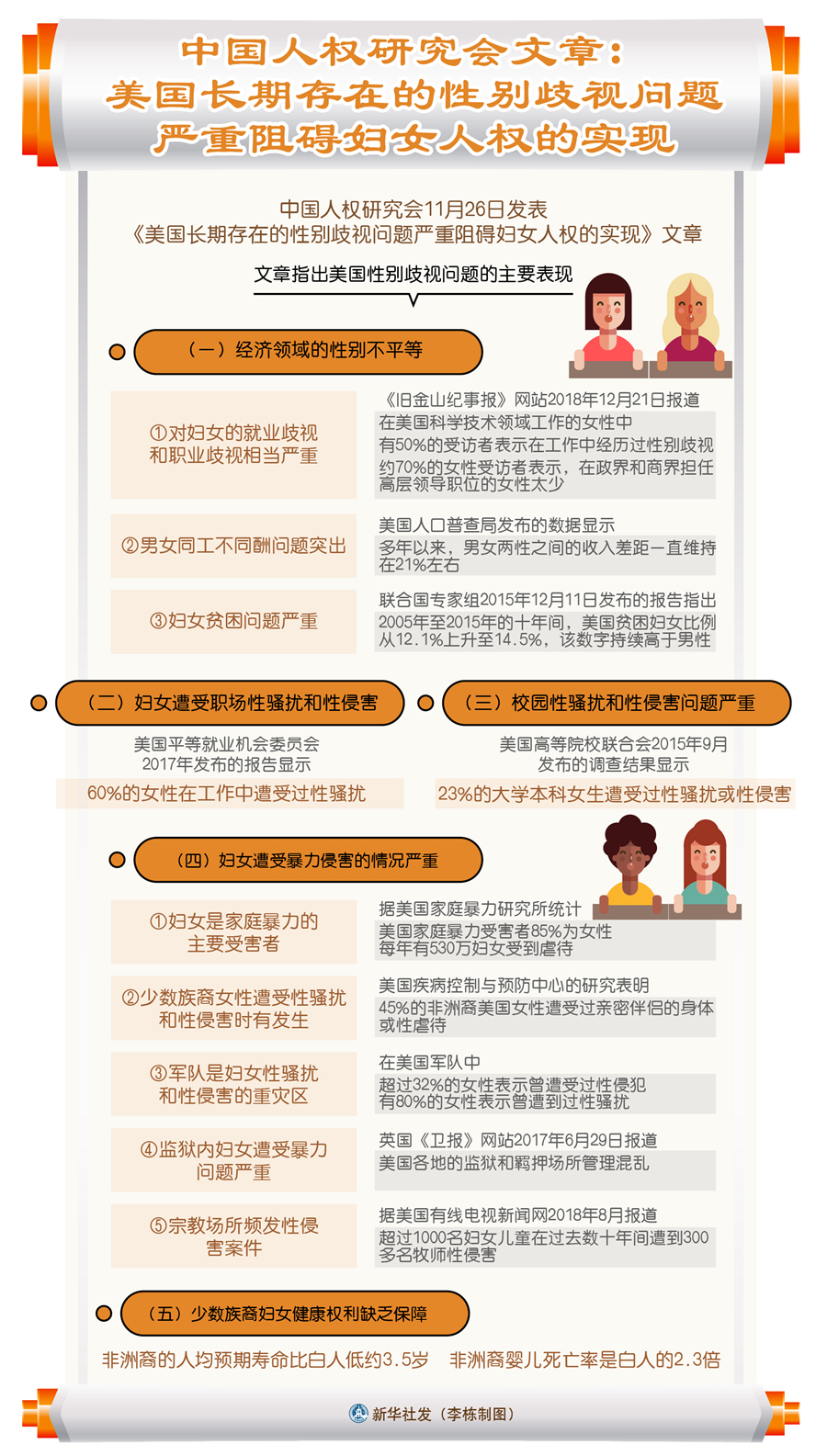 新華社北京11月26日電 中國人權研究會26日發表《美國長期存在的性別歧視問題嚴重阻礙婦女人權的實現》文章。全文如下: