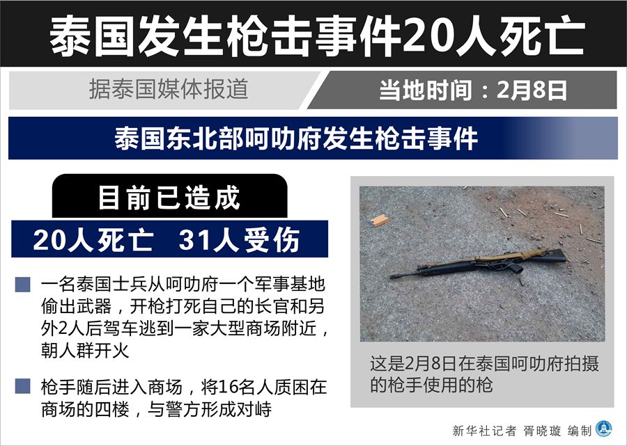 新華社曼谷2月8日電(記者汪瑾 任芊)據(jù)泰國媒體報(bào)道,泰國東北部呵叻府8日發(fā)生槍擊事件,目前已造成20人死亡、31人受傷。泰國特種部隊(duì)進(jìn)入槍手藏身的商場,商場內(nèi)大批民眾被疏散,但槍手目前所處位置尚不清楚。