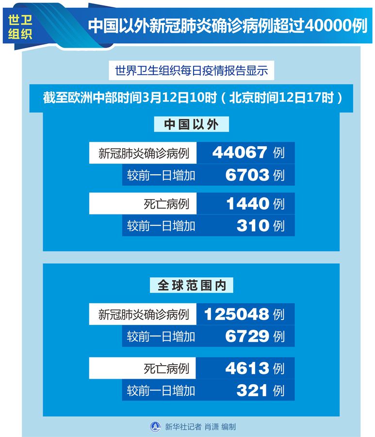 世衛組織每日疫情報告顯示,截至歐洲中部時間12日10時(北京時間12日17時),中國以外新冠肺炎確診病例較前一日增加6703例,達到44067例;中國以外死亡病例較前一日增加310例,達到1440例。