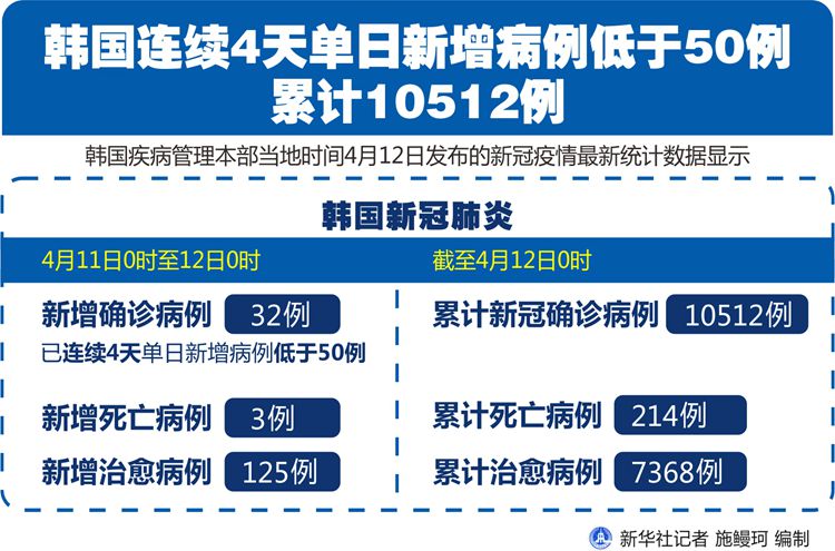 截至12日0時,韓國累計新冠確診病例達到10512例;新增死亡病例3例,累計死亡214例;新增治愈125例,累計治愈7368例。