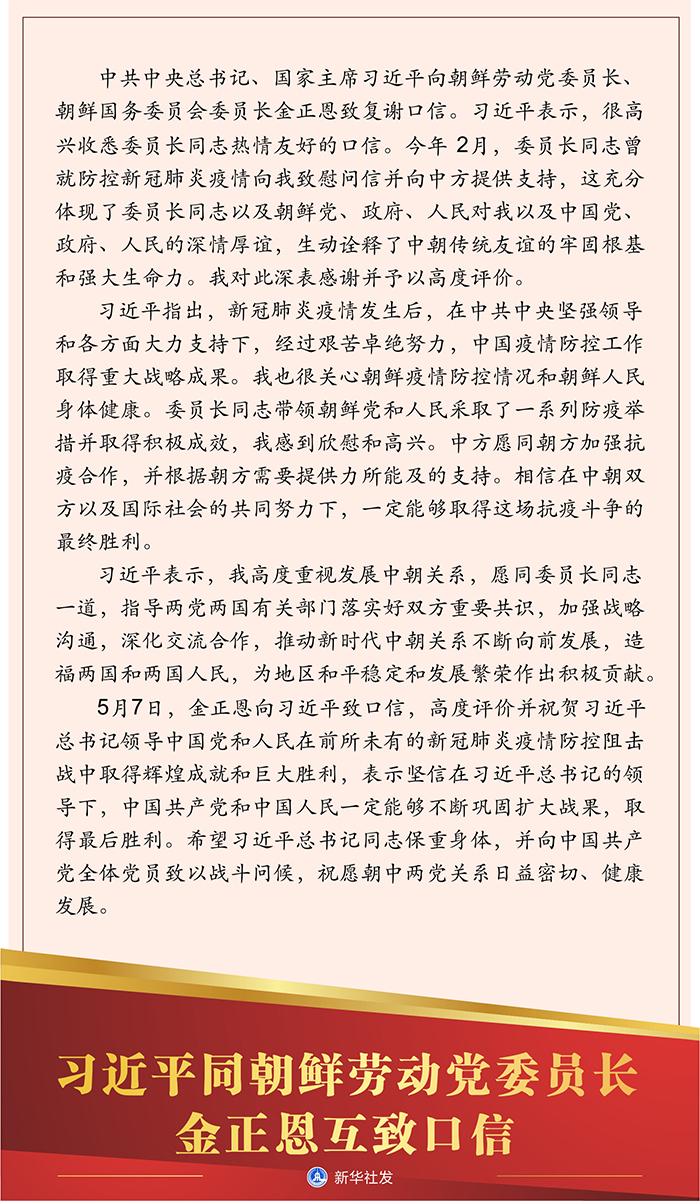 5月7日,金正恩向習(xí)近平致口信,高度評價并祝賀習(xí)近平總書記領(lǐng)導(dǎo)中國黨和人民在前所未有的新冠肺炎疫情防控阻擊戰(zhàn)中取得輝煌成就和巨大勝利,表示堅(jiān)信在習(xí)近平總書記的領(lǐng)導(dǎo)下,中國共產(chǎn)黨和中國人民一定能夠不斷鞏固擴(kuò)大戰(zhàn)果,取得最后勝利。希望習(xí)近平總書記同志保重身體,并向中國共產(chǎn)黨全體黨員致以戰(zhàn)斗問候,祝愿朝中兩黨關(guān)系日益密切、健康發(fā)展。
