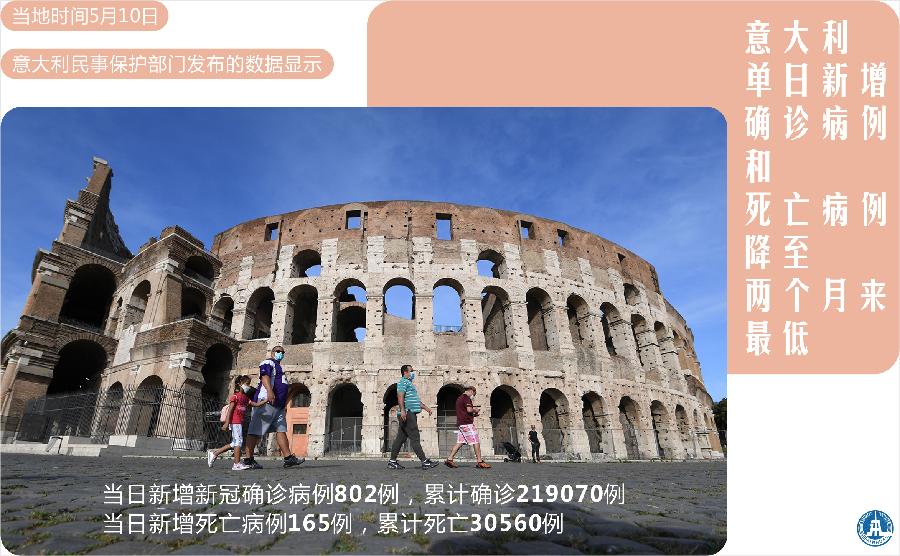 新華社羅馬5月10日電(記者李潔)意大利民事保護部門10日發(fā)布的數(shù)據(jù)顯示,意大利當天新增新冠確診病例802例,累計確診219070例;新增死亡病例165例,累計死亡30560例。單日新增確診病例和新增死亡病例均為過去兩個月來最低水平。