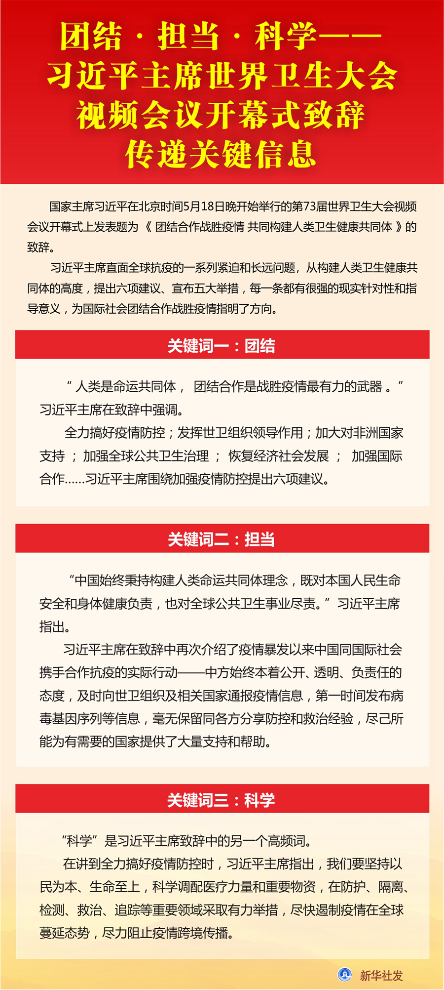 新華社北京5月18日電? 綜合新華社駐外記者報道:國家主席習(xí)近平18日晚在第73屆世界衛(wèi)生大會視頻會議開幕式上發(fā)表題為《團(tuán)結(jié)合作戰(zhàn)勝疫情 共同構(gòu)建人類衛(wèi)生健康共同體》的致辭。世界衛(wèi)生組織官員及多國人士認(rèn)為,習(xí)近平主席在致辭中提出的加強(qiáng)疫情防控六項建議、中國為推進(jìn)全球抗疫合作的五大舉措秉持構(gòu)建人類命運共同體理念,體現(xiàn)了中國負(fù)責(zé)任大國擔(dān)當(dāng),對推動抗擊疫情國際合作具有重要意義。