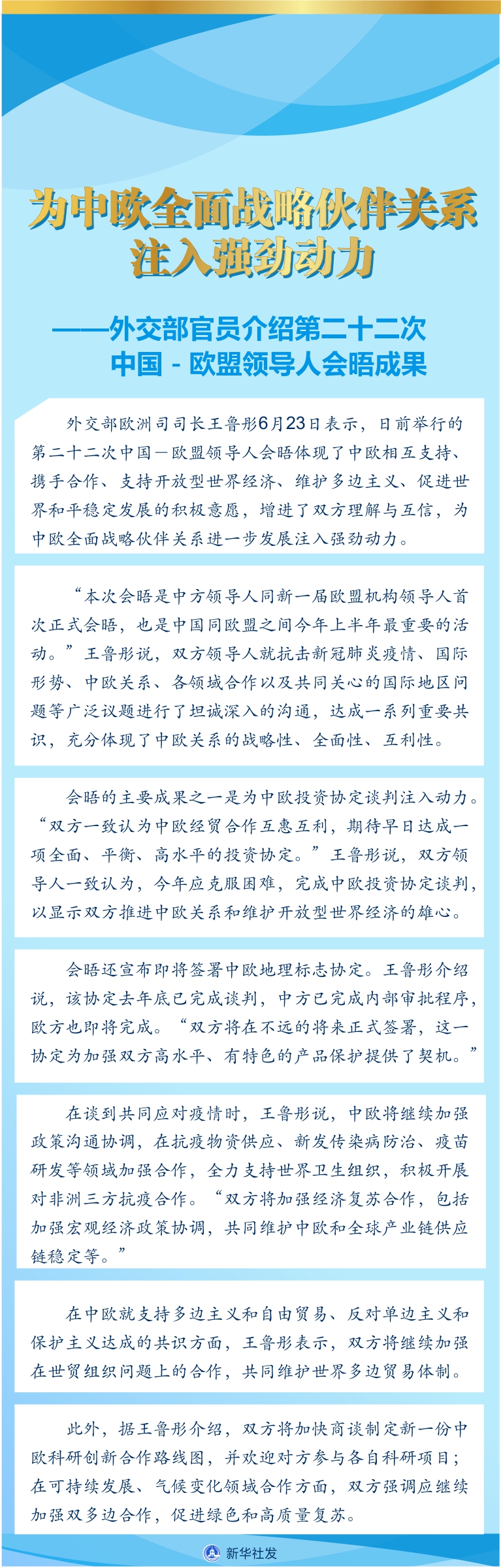 新華社北京6月23日電(記者王賓)外交部歐洲司司長王魯彤23日表示,日前舉行的第二十二次中國-歐盟領導人會晤體現(xiàn)了中歐相互支持、攜手合作、支持開放型世界經濟、維護多邊主義、促進世界和平穩(wěn)定發(fā)展的積極意愿,增進了雙方理解與互信,為中歐全面戰(zhàn)略伙伴關系進一步發(fā)展注入強勁動力。