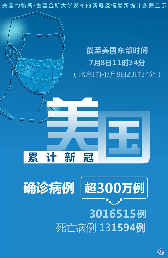 新華社紐約7月8日電 美國約翰斯·霍普金斯大學8日發布的新冠疫情最新統計數據顯示,美國累計確診病例超過300萬例。