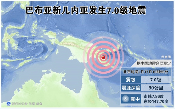 新華社快訊:中國地震臺網正式測定:7月17日10時50分在巴布亞新幾內亞(南緯7.86度,東經147.70度)發生7.0級地震,震源深度90千米。
