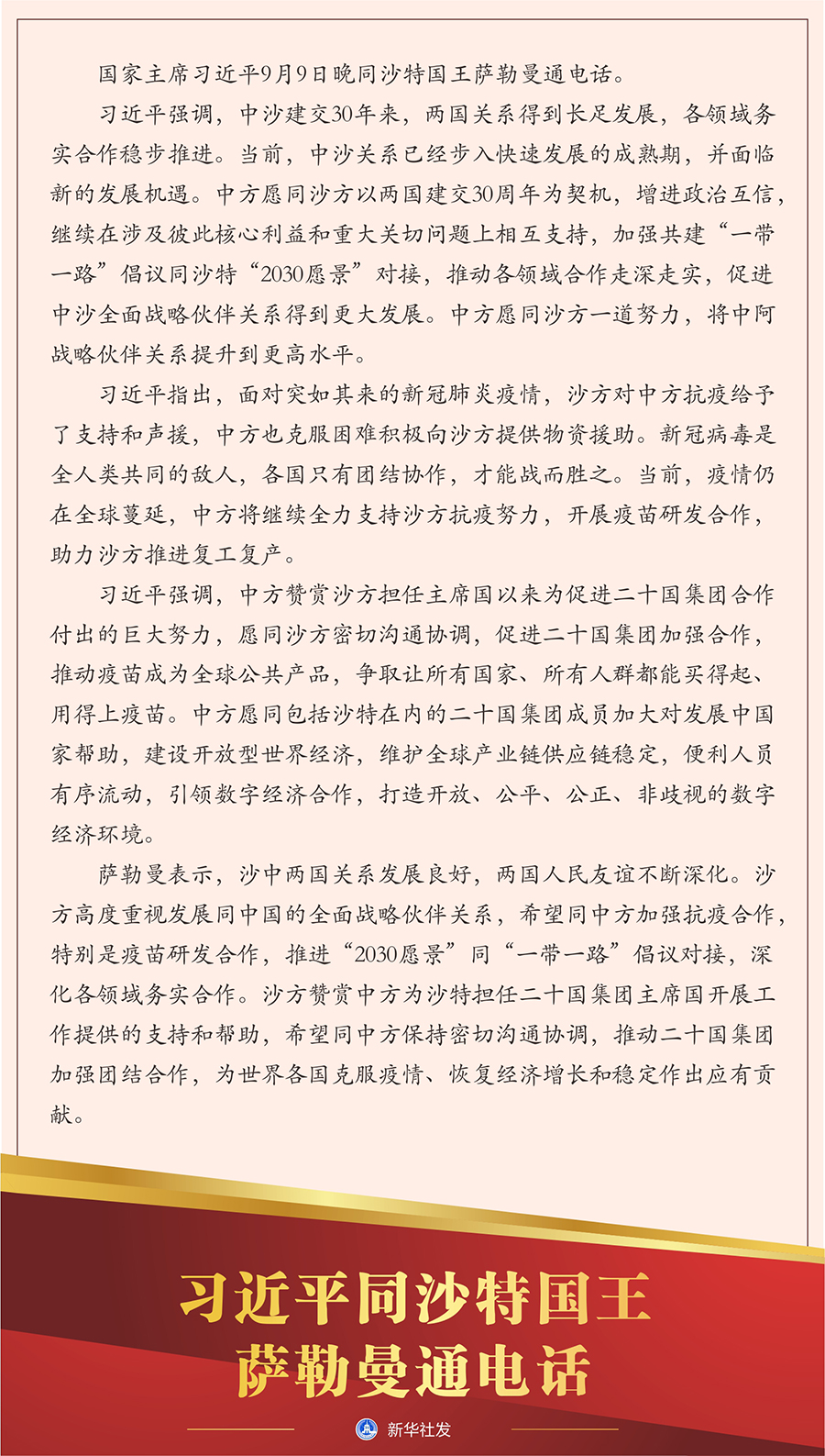 習近平指出,面對突如其來的新冠肺炎疫情,沙方對中方抗疫給予了支持和聲援,中方也克服困難積極向沙方提供物資援助。新冠病毒是全人類共同的敵人,各國只有團結(jié)協(xié)作,才能戰(zhàn)而勝之。當前,疫情仍在全球蔓延,中方將繼續(xù)全力支持沙方抗疫努力,開展疫苗研發(fā)合作,助力沙方推進復(fù)工復(fù)產(chǎn)。