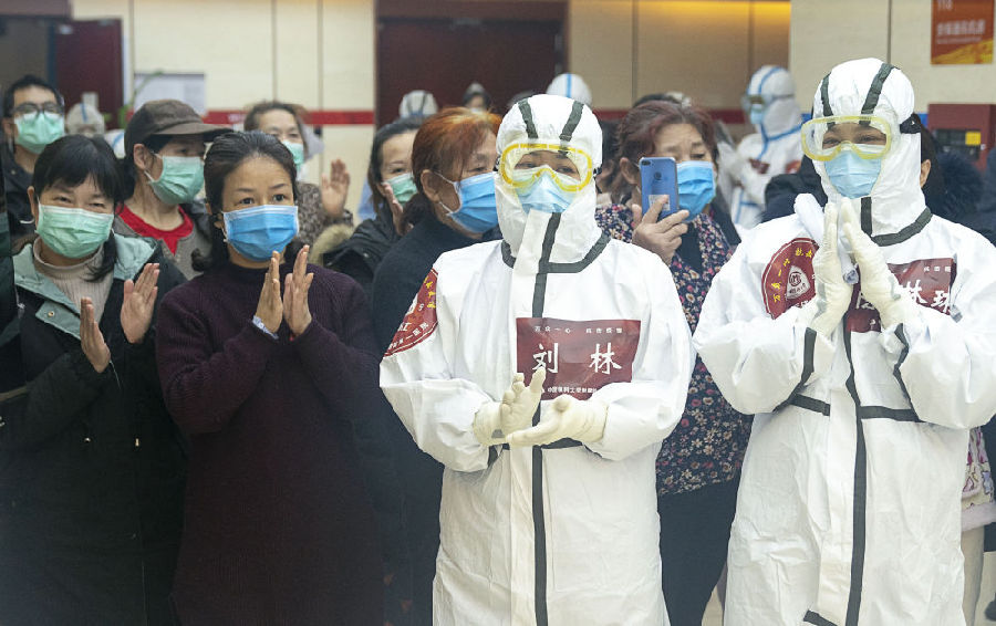 2020年3月8日,女性醫護人員和女性患者共同參加武昌方艙醫院內“三八”婦女節活動 (新華社記者熊琦 攝)