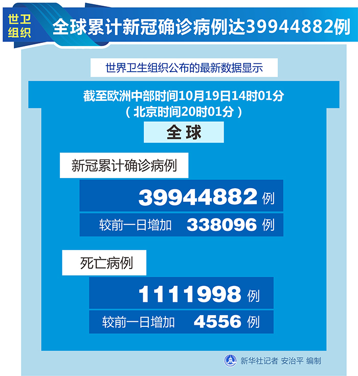 世衛組織網站最新數據顯示,截至歐洲中部時間19日14時01分(北京時間20時01分),全球確診病例較前一日增加338096例,達到39944882例;死亡病例增加4556例,達到1111998例。