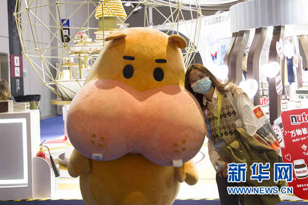 觀眾在第三屆進(jìn)博會上的食品及農(nóng)產(chǎn)品展區(qū)與人偶合影(11月5日攝)。新華網(wǎng) 吳一航 攝
