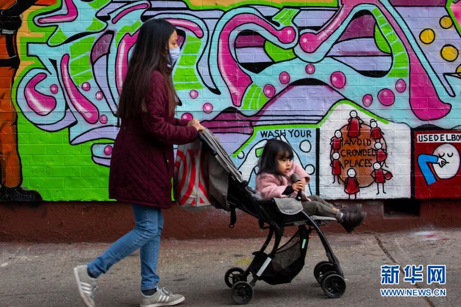 11月21日,在美國紐約,一名女子推著孩子經過抗疫宣傳壁畫。美國約翰斯·霍普金斯大學21日發布的新冠疫情最新統計數據顯示,美國累計確診病例超過1200萬例。新華社發(郭克攝)