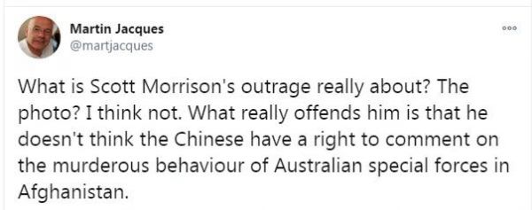 “莫里森的憤怒到底是什么?‘照片’?我想不是。真正令他惱怒的是,他認(rèn)為中國(guó)人無(wú)權(quán)對(duì)澳大利亞特種部隊(duì)在阿富汗的謀殺行為發(fā)表評(píng)論?!?/font>