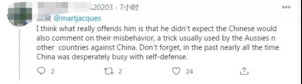 在這條推特下邊,許多網(wǎng)友為馬丁·雅克點(diǎn)贊。其中一位網(wǎng)友說(shuō)道:“我認(rèn)為真正讓他惱火的是,他沒(méi)想到中國(guó)人也會(huì)對(duì)他們的不當(dāng)行為發(fā)表評(píng)論,這是澳大利亞人和其他國(guó)家對(duì)付中國(guó)的慣用伎倆。別忘了,在過(guò)去幾乎所有的時(shí)間里,中國(guó)都在拼命地進(jìn)行自衛(wèi)?!?/p>