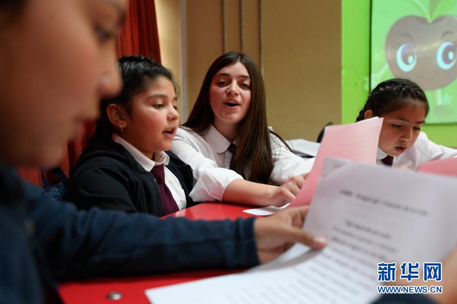 2019年10月11日,洛蕾托·約斯在智利南部紐夫萊大區的圣尼古拉斯中學利用課外時間教授低年級學生漢語。新華社發(豪爾赫·比列加斯攝)